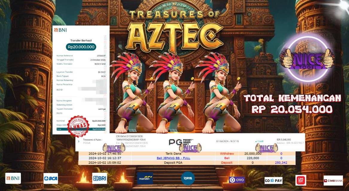Selamat kepada User id : JOE2*** Telah berhasil mendapatkan kemenangan besar pada permainan SLOT TREASURES OF AZTEC Dengan kemenangan Sebesar Rp.20.054.000,- Setelah mengisi formulir withdraw dengan kurung waktu hanya 5 – 10 menit pihak NICETOGEL sudah melakukan transfer kepada pemilik Userid dan dana sudah dapat di cairkan oleh pemenang. Bukti pembayaran yang kami berikan merupakan bukti pembayaran yang SAH / VALID yang langung di dapatkan melaui tanda transfer transaksi dari Bank yang di tuju.