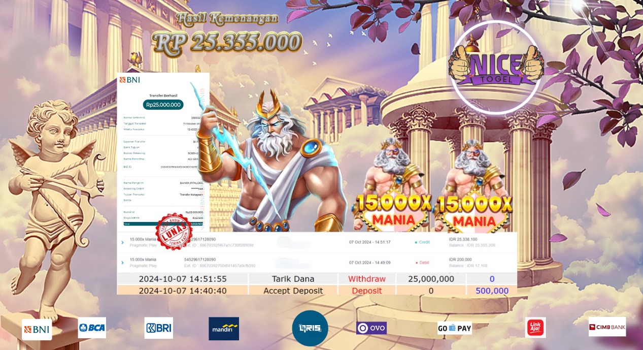 Selamat kepada User id : cars75*** Telah berhasil mendapatkan kemenangan besar pada permainan SLOT 15.000X MANIA Dengan kemenangan Sebesar Rp. 25.355.000,- Setelah mengisi formulir withdraw dengan kurung waktu hanya 5 – 10 menit pihak NICETOGEL sudah melakukan transfer kepada pemilik Userid dan dana sudah dapat di cairkan oleh pemenang. Bukti pembayaran yang kami berikan merupakan bukti pembayaran yang SAH / VALID yang langung di dapatkan melaui tanda transfer transaksi dari Bank yang di tuju.
