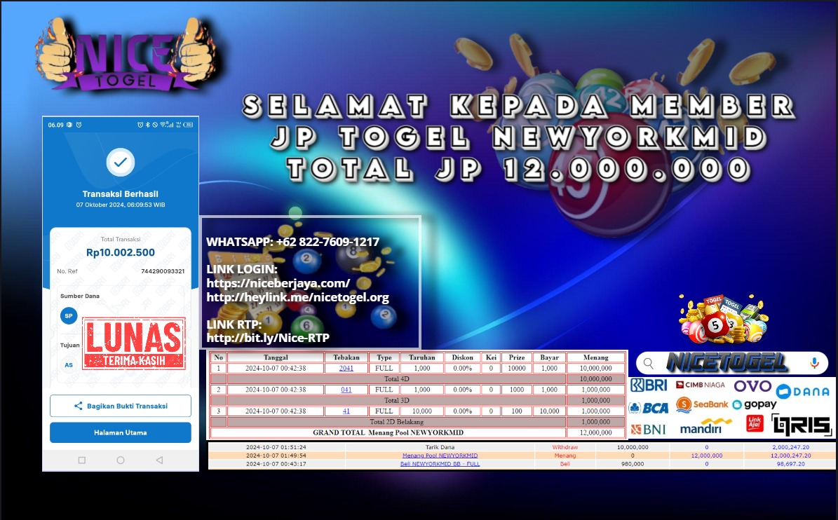 Selamat kepada User id : Lop562*** Telah berhasil mendapatkan kemenangan besar pada permainan TOGEL NEWYORK MID Dengan kemenangan Sebesar Rp. 12.000.000,- Setelah mengisi formulir withdraw dengan kurung waktu hanya 5 – 10 menit pihak NICETOGEL sudah melakukan transfer kepada pemilik Userid dan dana sudah dapat di cairkan oleh pemenang. Bukti pembayaran yang kami berikan merupakan bukti pembayaran yang SAH / VALID yang langung di dapatkan melaui tanda transfer transaksi dari Bank yang di tuju.