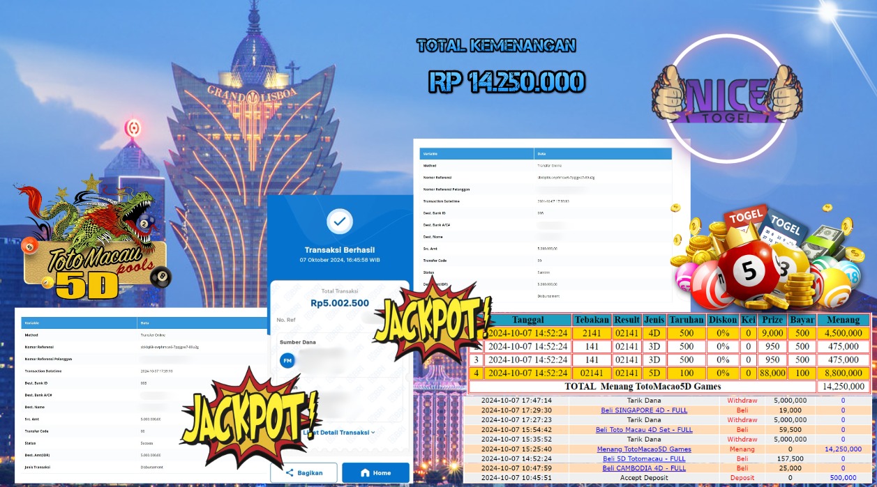 Selamat kepada User id : Algoj*** Telah berhasil mendapatkan kemenangan besar pada permainan TOGEL TOTO MACAU 5D Dengan kemenangan Sebesar Rp.14.250.000,- Setelah mengisi formulir withdraw dengan kurung waktu hanya 5 – 10 menit pihak NICETOGEL sudah melakukan transfer kepada pemilik Userid dan dana sudah dapat di cairkan oleh pemenang. Bukti pembayaran yang kami berikan merupakan bukti pembayaran yang SAH / VALID yang langung di dapatkan melaui tanda transfer transaksi dari Bank yang di tuju.