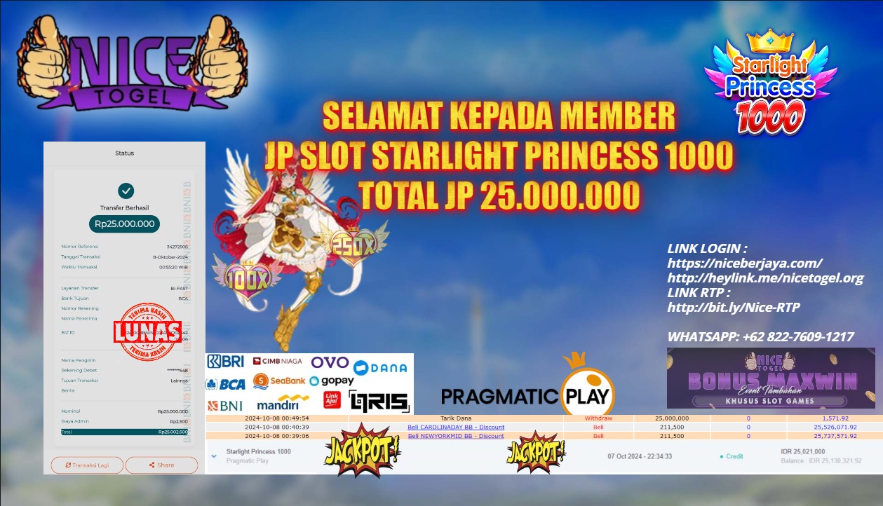 Selamat kepada User id : av*** Telah berhasil mendapatkan kemenangan besar pada permainan SLOT STARLIGHT PRINCESS 1000 Dengan kemenangan Sebesar Rp.25.000.000,- Setelah mengisi formulir withdraw dengan kurung waktu hanya 5 – 10 menit pihak NICETOGEL sudah melakukan transfer kepada pemilik Userid dan dana sudah dapat di cairkan oleh pemenang. Bukti pembayaran yang kami berikan merupakan bukti pembayaran yang SAH / VALID yang langung di dapatkan melaui tanda transfer transaksi dari Bank yang di tuju.