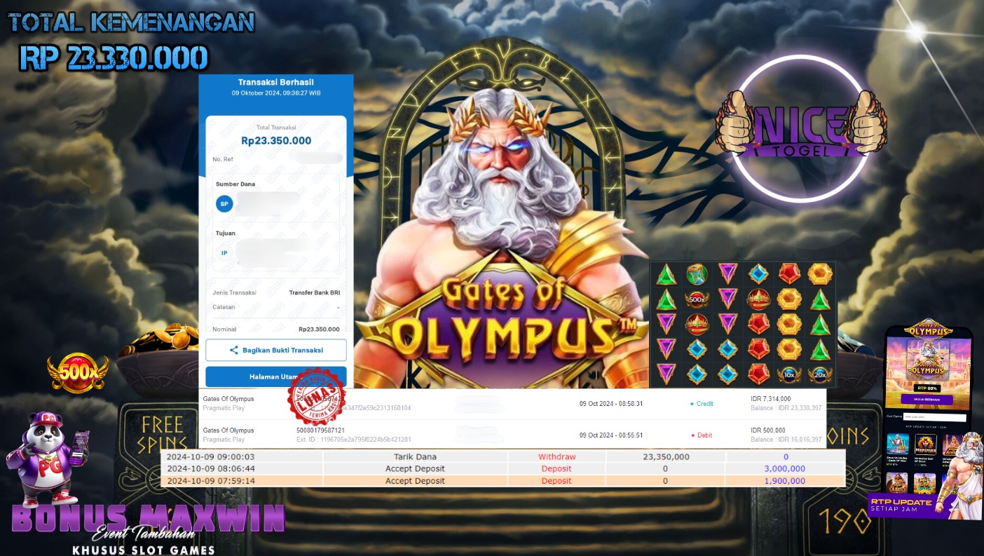 Selamat kepada User id : Poda52*** Telah berhasil mendapatkan kemenangan besar pada permainan SLOT GATES OF OLYMPUS Dengan kemenangan Sebesar Rp.23.330.000,- Setelah mengisi formulir withdraw dengan kurung waktu hanya 5 – 10 menit pihak NICETOGEL sudah melakukan transfer kepada pemilik Userid dan dana sudah dapat di cairkan oleh pemenang. Bukti pembayaran yang kami berikan merupakan bukti pembayaran yang SAH / VALID yang langung di dapatkan melaui tanda transfer transaksi dari Bank yang di tuju.