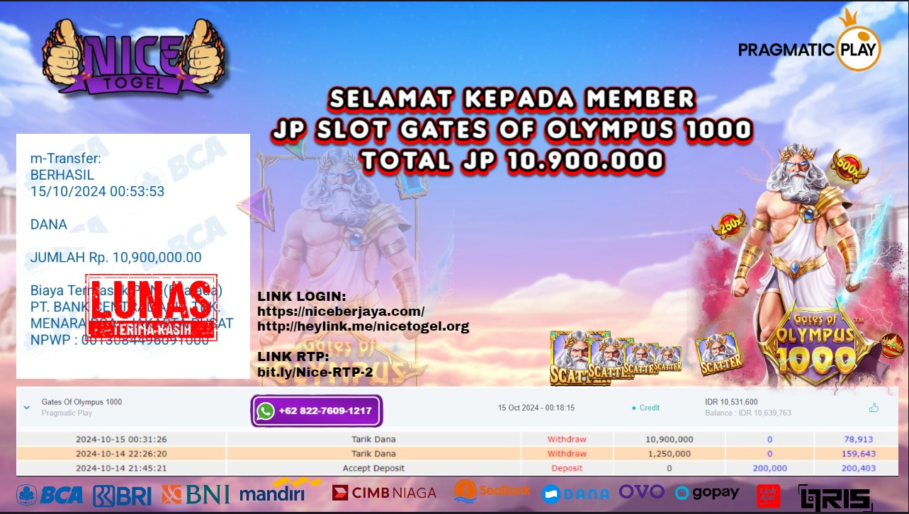 Selamat kepada User id : ans*** Telah berhasil mendapatkan kemenangan besar pada permainan SLOT GATES OF OLYMPUS 1000 Dengan kemenangan Sebesar Rp.10.900.000,- Setelah mengisi formulir withdraw dengan kurung waktu hanya 5 – 10 menit pihak NICETOGEL sudah melakukan transfer kepada pemilik Userid dan dana sudah dapat di cairkan oleh pemenang. Bukti pembayaran yang kami berikan merupakan bukti pembayaran yang SAH / VALID yang langung di dapatkan melaui tanda transfer transaksi dari Bank yang di tuju.