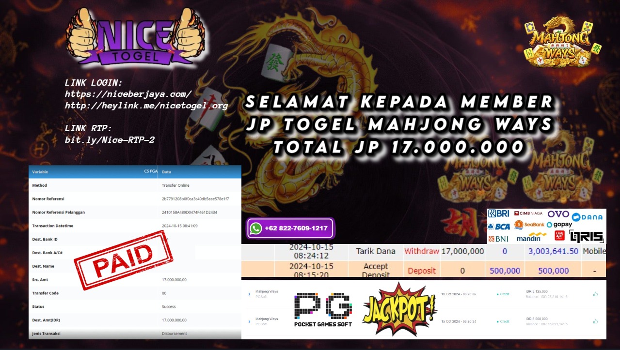 Selamat kepada User id : azk*** Telah berhasil mendapatkan kemenangan besar pada permainan SLOT MAHJONG WAYS Dengan kemenangan Sebesar Rp.17.000.000,- Setelah mengisi formulir withdraw dengan kurung waktu hanya 5 – 10 menit pihak NICETOGEL sudah melakukan transfer kepada pemilik Userid dan dana sudah dapat di cairkan oleh pemenang. Bukti pembayaran yang kami berikan merupakan bukti pembayaran yang SAH / VALID yang langung di dapatkan melaui tanda transfer transaksi dari Bank yang di tuju.