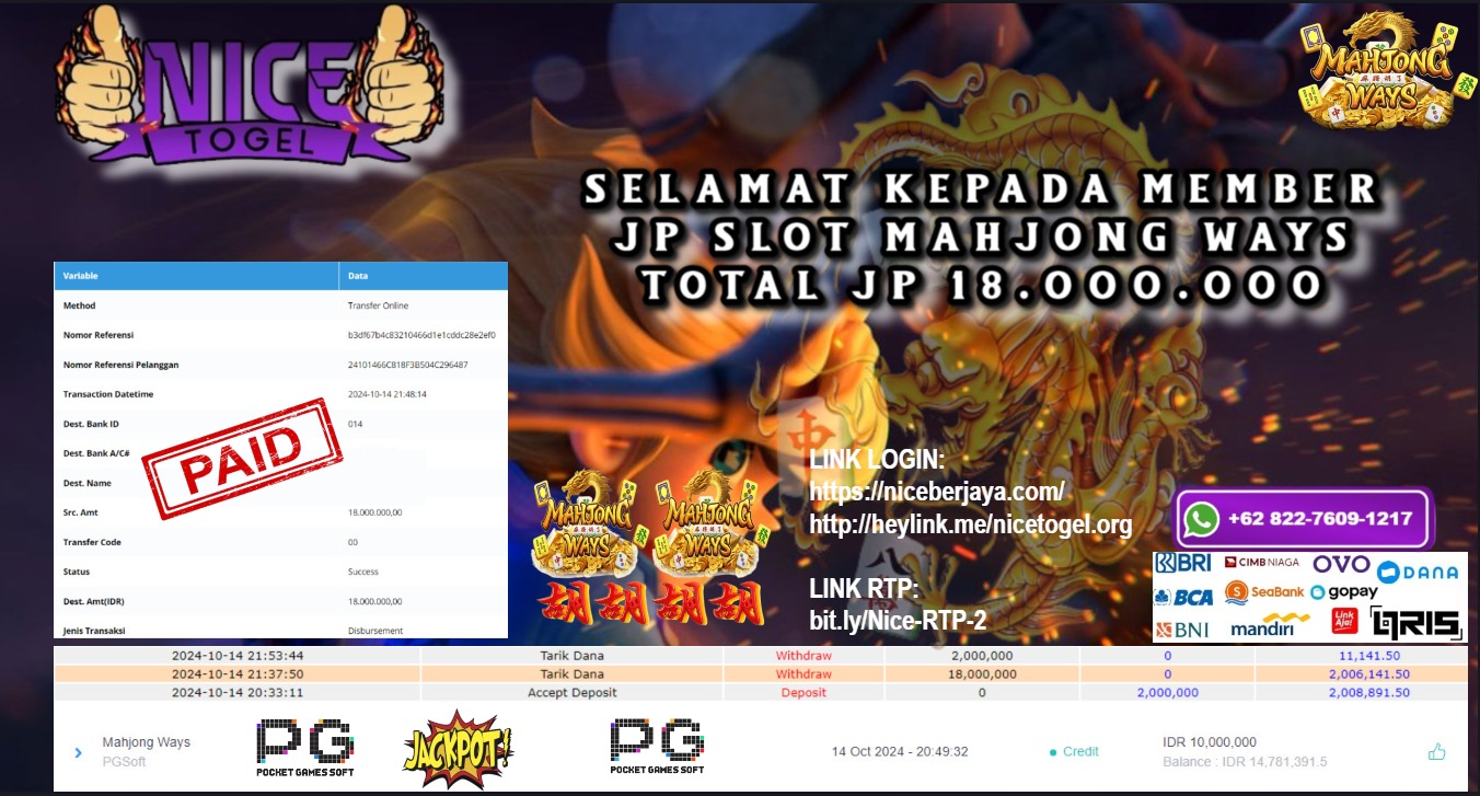 Selamat kepada User id : bast*** Telah berhasil mendapatkan kemenangan besar pada permainan SLOT MAHJONG WAYS Dengan kemenangan Sebesar Rp.18.000.000,- Setelah mengisi formulir withdraw dengan kurung waktu hanya 5 – 10 menit pihak NICETOGEL sudah melakukan transfer kepada pemilik Userid dan dana sudah dapat di cairkan oleh pemenang. Bukti pembayaran yang kami berikan merupakan bukti pembayaran yang SAH / VALID yang langung di dapatkan melaui tanda transfer transaksi dari Bank yang di tuju.