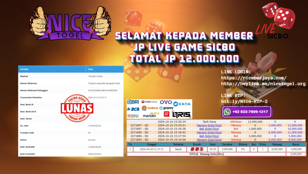 Selamat kepada User id : ahm*** Telah berhasil mendapatkan kemenangan besar pada permainan LIVE GAMES SICBO Dengan kemenangan Sebesar Rp.12.000.000,- Setelah mengisi formulir withdraw dengan kurung waktu hanya 5 – 10 menit pihak NICETOGEL sudah melakukan transfer kepada pemilik Userid dan dana sudah dapat di cairkan oleh pemenang. Bukti pembayaran yang kami berikan merupakan bukti pembayaran yang SAH / VALID yang langung di dapatkan melaui tanda transfer transaksi dari Bank yang di tuju.