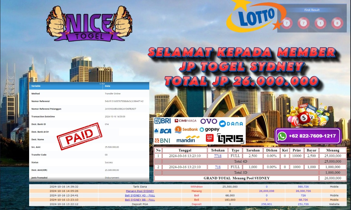 Selamat kepada User id : do*** Telah berhasil mendapatkan kemenangan besar pada permainan TOGEL SYDNEY POOLS Dengan kemenangan Sebesar Rp.26.000.000,- Setelah mengisi formulir withdraw dengan kurung waktu hanya 5 – 10 menit pihak NICETOGEL sudah melakukan transfer kepada pemilik Userid dan dana sudah dapat di cairkan oleh pemenang. Bukti pembayaran yang kami berikan merupakan bukti pembayaran yang SAH / VALID yang langung di dapatkan melaui tanda transfer transaksi dari Bank yang di tuju.
