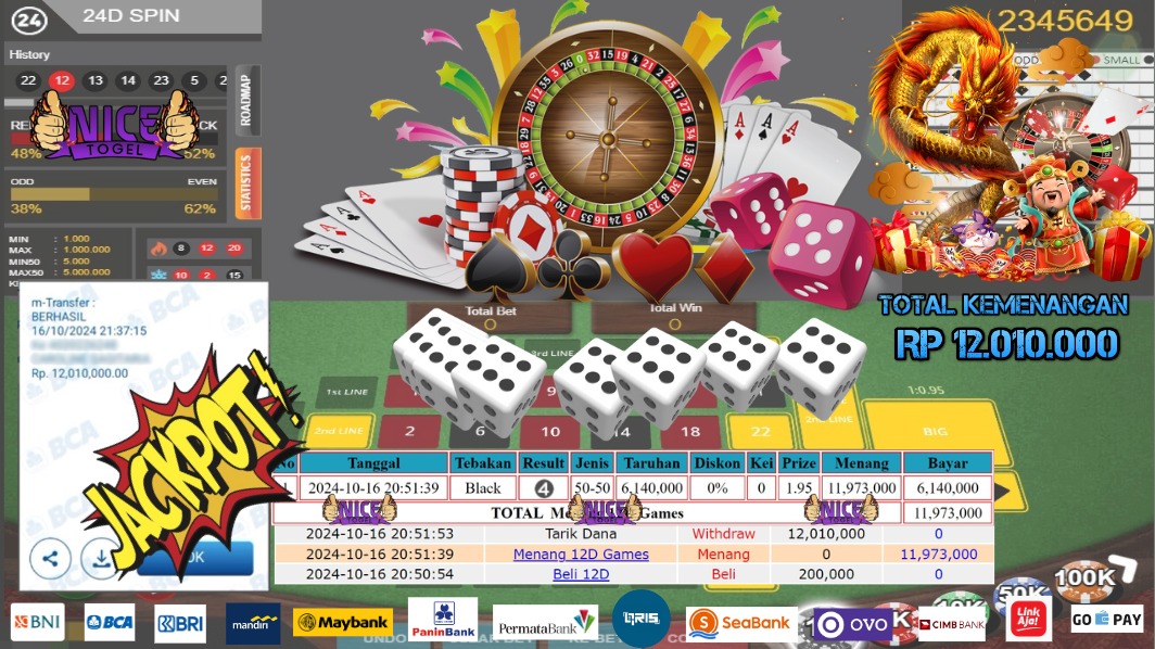 Selamat kepada User id : jk55*** Telah berhasil mendapatkan kemenangan besar pada permainan LIVE GAMES 12D Dengan kemenangan Sebesar Rp.12.010.000,- Setelah mengisi formulir withdraw dengan kurung waktu hanya 5 – 10 menit pihak NICETOGEL sudah melakukan transfer kepada pemilik Userid dan dana sudah dapat di cairkan oleh pemenang. Bukti pembayaran yang kami berikan merupakan bukti pembayaran yang SAH / VALID yang langung di dapatkan melaui tanda transfer transaksi dari Bank yang di tuju.