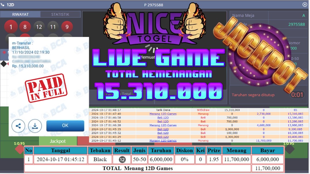 Selamat kepada User id : toa53*** Telah berhasil mendapatkan kemenangan besar pada permainan LIVE GAMES 12D Dengan kemenangan Sebesar Rp.15.310.000,- Setelah mengisi formulir withdraw dengan kurung waktu hanya 5 – 10 menit pihak NICETOGEL sudah melakukan transfer kepada pemilik Userid dan dana sudah dapat di cairkan oleh pemenang. Bukti pembayaran yang kami berikan merupakan bukti pembayaran yang SAH / VALID yang langung di dapatkan melaui tanda transfer transaksi dari Bank yang di tuju.