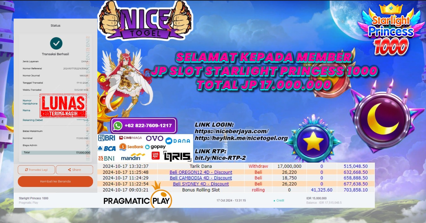 Selamat kepada User id : as11*** Telah berhasil mendapatkan kemenangan besar pada permainan SLOT STARLIGHT PRINCES1000 Dengan kemenangan Sebesar Rp.17.000.000,- Setelah mengisi formulir withdraw dengan kurung waktu hanya 5 – 10 menit pihak NICETOGEL sudah melakukan transfer kepada pemilik Userid dan dana sudah dapat di cairkan oleh pemenang. Bukti pembayaran yang kami berikan merupakan bukti pembayaran yang SAH / VALID yang langung di dapatkan melaui tanda transfer transaksi dari Bank yang di tuju.