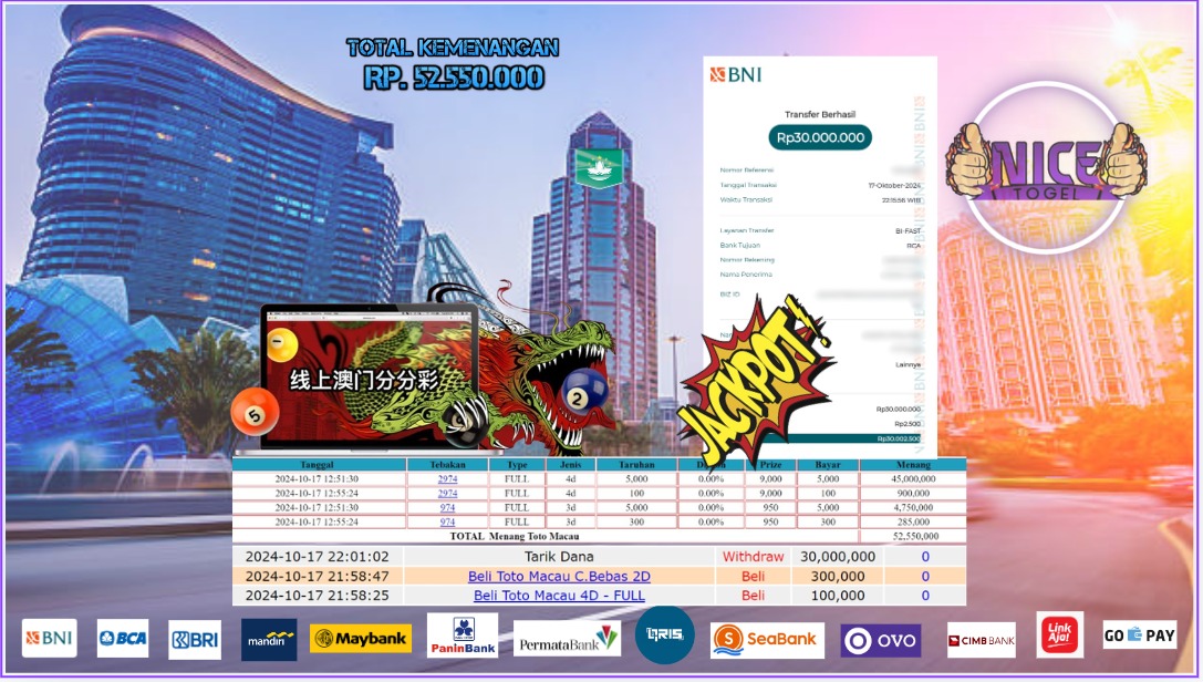 Selamat kepada User id : tet13*** Telah berhasil mendapatkan kemenangan besar pada permainan TOTO MACAU Dengan kemenangan Sebesar Rp.52.550.000,- Setelah mengisi formulir withdraw dengan kurung waktu hanya 5 – 10 menit pihak NICETOGEL sudah melakukan transfer kepada pemilik Userid dan dana sudah dapat di cairkan oleh pemenang. Bukti pembayaran yang kami berikan merupakan bukti pembayaran yang SAH / VALID yang langung di dapatkan melaui tanda transfer transaksi dari Bank yang di tuju.