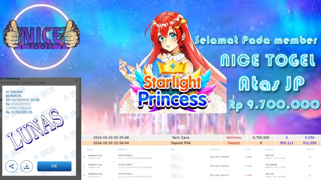 Selamat kepada User id : zer*** Telah berhasil mendapatkan kemenangan besar pada permainan SLOT STARLIGHT PRINCES Dengan kemenangan Sebesar Rp.9.700.000,- Setelah mengisi formulir withdraw dengan kurung waktu hanya 5 – 10 menit pihak NICETOGEL sudah melakukan transfer kepada pemilik Userid dan dana sudah dapat di cairkan oleh pemenang. Bukti pembayaran yang kami berikan merupakan bukti pembayaran yang SAH / VALID yang langung di dapatkan melaui tanda transfer transaksi dari Bank yang di tuju.