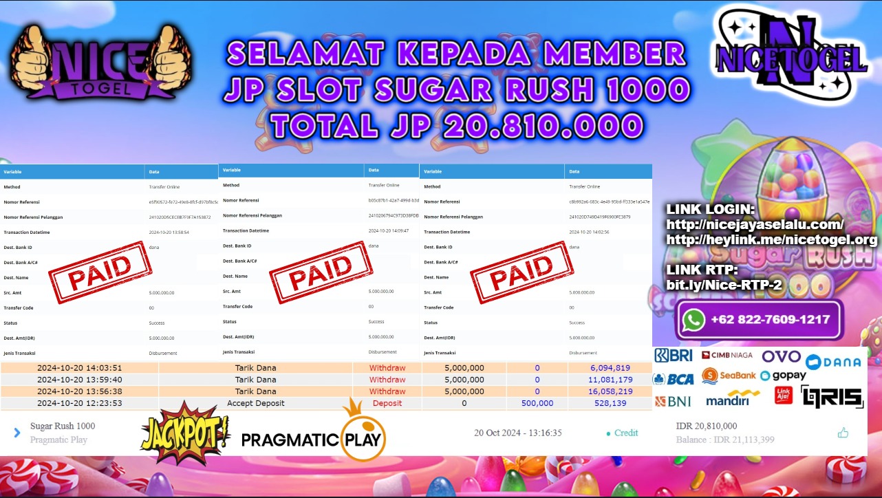 Selamat kepada User id : panj*** Telah berhasil mendapatkan kemenangan besar pada permainan SLOT SUGAR RUSH 1000 Dengan kemenangan Sebesar Rp.20.810.000,- Setelah mengisi formulir withdraw dengan kurung waktu hanya 5 – 10 menit pihak NICETOGEL sudah melakukan transfer kepada pemilik Userid dan dana sudah dapat di cairkan oleh pemenang. Bukti pembayaran yang kami berikan merupakan bukti pembayaran yang SAH / VALID yang langung di dapatkan melaui tanda transfer transaksi dari Bank yang di tuju.