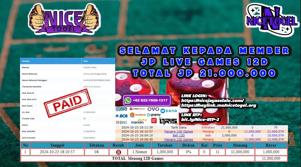 Selamat kepada User id : Jar*** Telah berhasil mendapatkan kemenangan besar pada permainan LIVE GAMES 12D Dengan kemenangan Sebesar Rp.21.000.000,- Setelah mengisi formulir withdraw dengan kurung waktu hanya 5 – 10 menit pihak NICETOGEL sudah melakukan transfer kepada pemilik Userid dan dana sudah dapat di cairkan oleh pemenang. Bukti pembayaran yang kami berikan merupakan bukti pembayaran yang SAH / VALID yang langung di dapatkan melaui tanda transfer transaksi dari Bank yang di tuju.