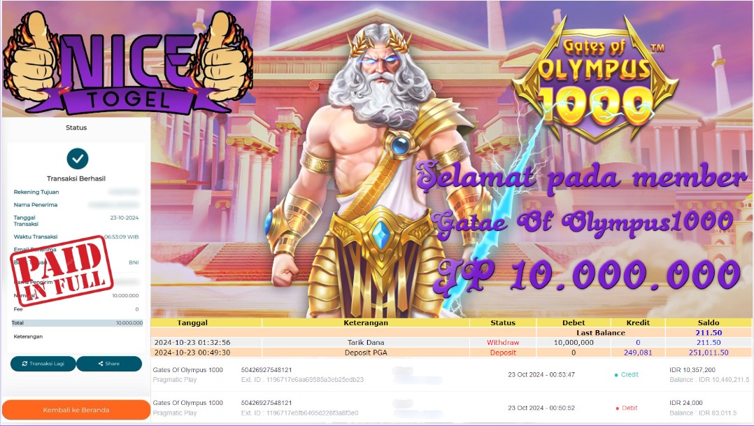 Selamat kepada User id : Ores*** Telah berhasil mendapatkan kemenangan besar pada permainan SLOT GATES OF OLYMPUS 1000 Dengan kemenangan Sebesar Rp.10.000.000,- Setelah mengisi formulir withdraw dengan kurung waktu hanya 5 – 10 menit pihak NICETOGEL sudah melakukan transfer kepada pemilik Userid dan dana sudah dapat di cairkan oleh pemenang. Bukti pembayaran yang kami berikan merupakan bukti pembayaran yang SAH / VALID yang langung di dapatkan melaui tanda transfer transaksi dari Bank yang di tuju.
