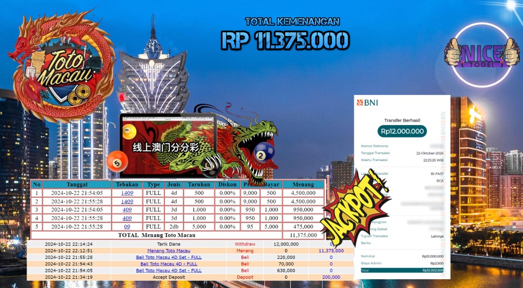 Selamat kepada User id : jerr*** Telah berhasil mendapatkan kemenangan besar pada permainan TOTO MACAU Dengan kemenangan Sebesar Rp.11.375.000,- Setelah mengisi formulir withdraw dengan kurung waktu hanya 5 – 10 menit pihak NICETOGEL sudah melakukan transfer kepada pemilik Userid dan dana sudah dapat di cairkan oleh pemenang. Bukti pembayaran yang kami berikan merupakan bukti pembayaran yang SAH / VALID yang langung di dapatkan melaui tanda transfer transaksi dari Bank yang di tuju.