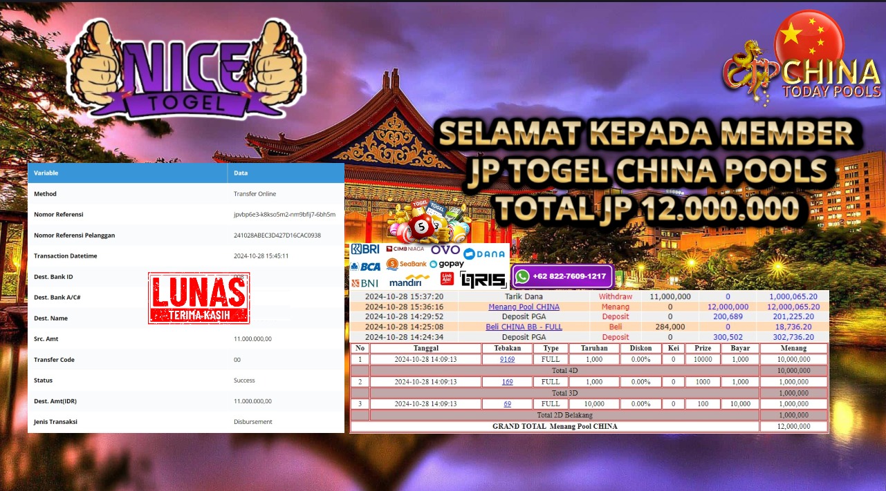 Selamat kepada User id : mau*** Telah berhasil mendapatkan kemenangan besar pada permainan TOGEL CHINA POOLS Dengan kemenangan Sebesar Rp.12.000.000,- Setelah mengisi formulir withdraw dengan kurung waktu hanya 5 – 10 menit pihak NICETOGEL sudah melakukan transfer kepada pemilik Userid dan dana sudah dapat di cairkan oleh pemenang. Bukti pembayaran yang kami berikan merupakan bukti pembayaran yang SAH / VALID yang langung di dapatkan melaui tanda transfer transaksi dari Bank yang di tuju.