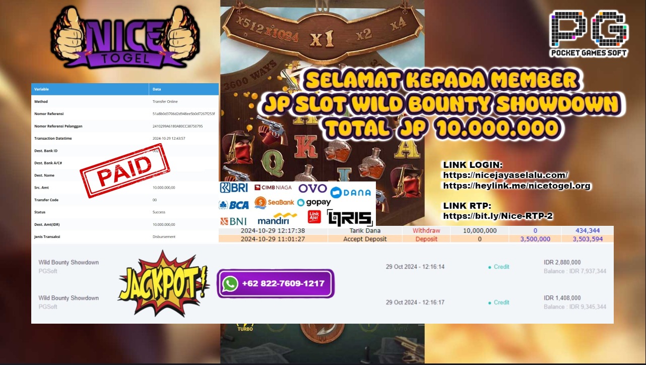 Selamat kepada User id : nam*** Telah berhasil mendapatkan kemenangan besar pada permainan SLOT WILD BOUNTY SHOWDOWN Dengan kemenangan Sebesar Rp.10.000.000,- Setelah mengisi formulir withdraw dengan kurung waktu hanya 5 – 10 menit pihak NICETOGEL sudah melakukan transfer kepada pemilik Userid dan dana sudah dapat di cairkan oleh pemenang. Bukti pembayaran yang kami berikan merupakan bukti pembayaran yang SAH / VALID yang langung di dapatkan melaui tanda transfer transaksi dari Bank yang di tuju.