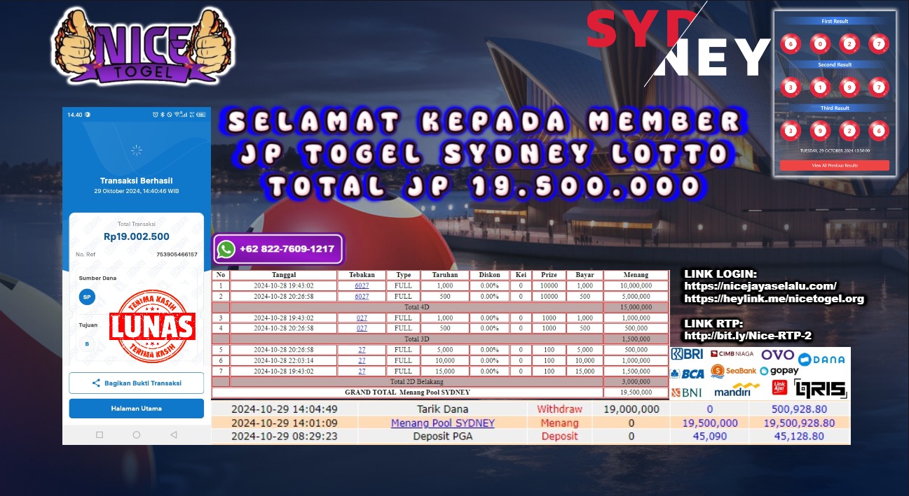 Selamat kepada User id : azk*** Telah berhasil mendapatkan kemenangan besar pada permainan TOGEL SYDNEY POOLS Dengan kemenangan Sebesar Rp.19.500.000,- Setelah mengisi formulir withdraw dengan kurung waktu hanya 5 – 10 menit pihak NICETOGEL sudah melakukan transfer kepada pemilik Userid dan dana sudah dapat di cairkan oleh pemenang. Bukti pembayaran yang kami berikan merupakan bukti pembayaran yang SAH / VALID yang langung di dapatkan melaui tanda transfer transaksi dari Bank yang di tuju.
