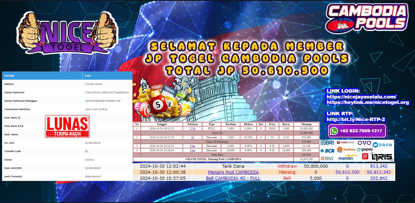 Selamat kepada User id : leo*** Telah berhasil mendapatkan kemenangan besar pada permainan TOGEL CAMBODIA POOLS Dengan kemenangan Sebesar Rp.50.610.500,- Setelah mengisi formulir withdraw dengan kurung waktu hanya 5 – 10 menit pihak NICETOGEL sudah melakukan transfer kepada pemilik Userid dan dana sudah dapat di cairkan oleh pemenang. Bukti pembayaran yang kami berikan merupakan bukti pembayaran yang SAH / VALID yang langung di dapatkan melaui tanda transfer transaksi dari Bank yang di tuju.
