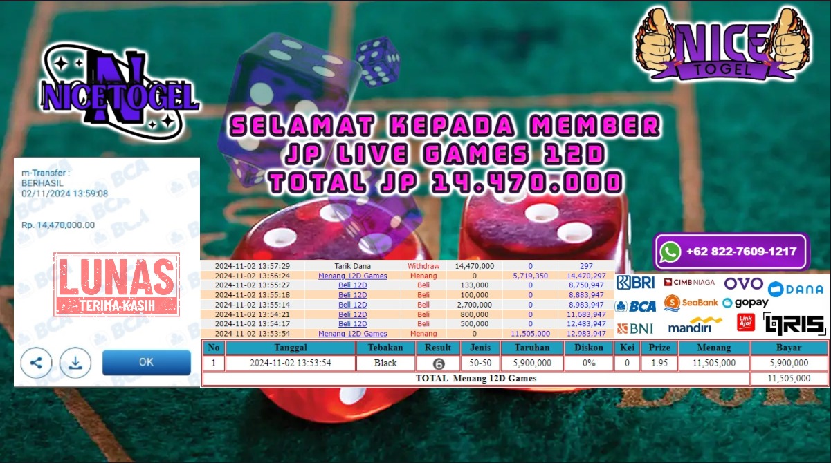 Selamat kepada User id : nin*** Telah berhasil mendapatkan kemenangan besar pada permainan LIVE GAMES 12D Dengan kemenangan Sebesar Rp.14.470.000,- Setelah mengisi formulir withdraw dengan kurung waktu hanya 5 – 10 menit pihak NICETOGEL sudah melakukan transfer kepada pemilik Userid dan dana sudah dapat di cairkan oleh pemenang. Bukti pembayaran yang kami berikan merupakan bukti pembayaran yang SAH / VALID yang langung di dapatkan melaui tanda transfer transaksi dari Bank yang di tuju.