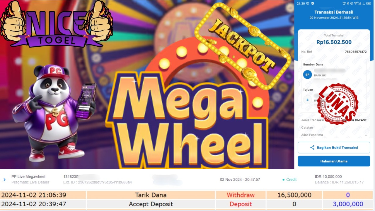 Selamat kepada User id : SNAN*** Telah berhasil mendapatkan kemenangan besar pada permainan LIVE GAMES MEGAWHEEL Dengan kemenangan Sebesar Rp.16.502.500,- Setelah mengisi formulir withdraw dengan kurung waktu hanya 5 – 10 menit pihak NICETOGEL sudah melakukan transfer kepada pemilik Userid dan dana sudah dapat di cairkan oleh pemenang. Bukti pembayaran yang kami berikan merupakan bukti pembayaran yang SAH / VALID yang langung di dapatkan melaui tanda transfer transaksi dari Bank yang di tuju.