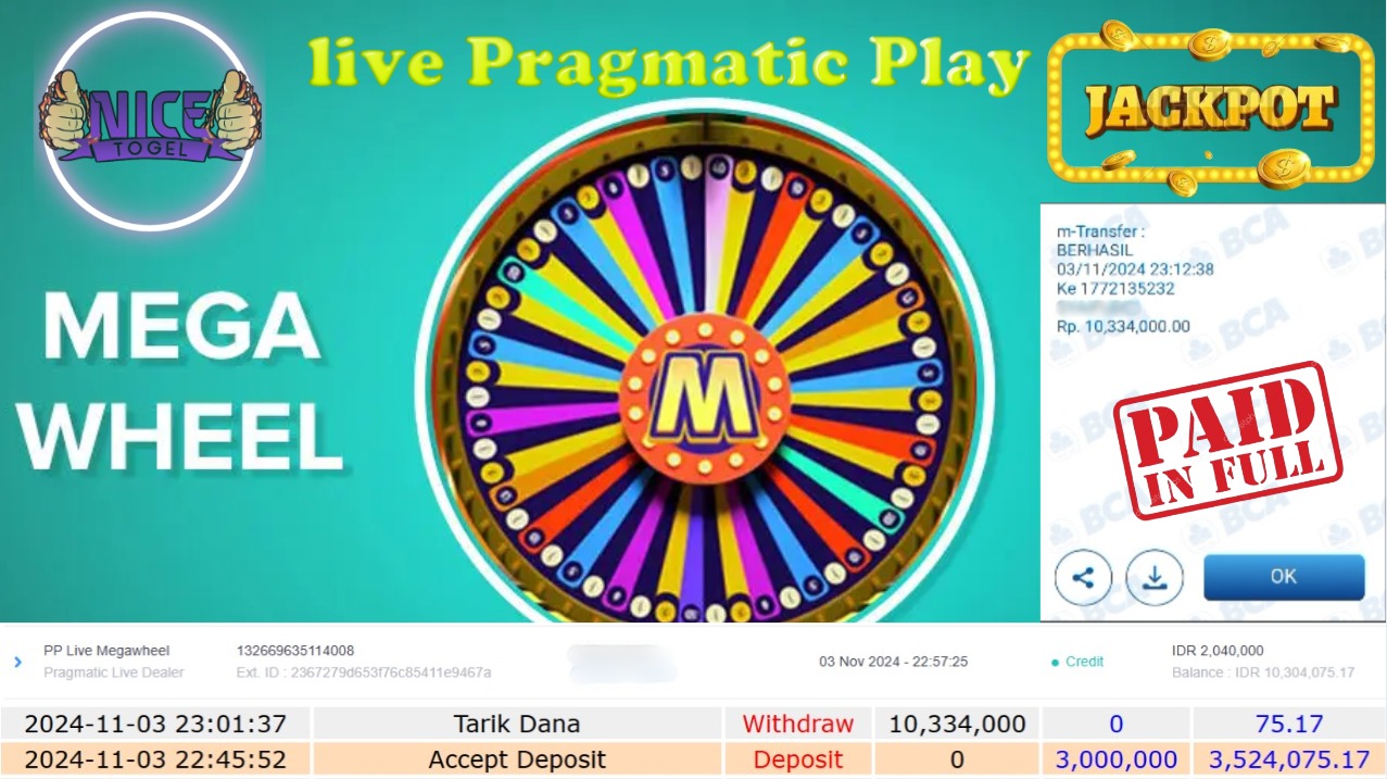 Selamat kepada User id : puf*** Telah berhasil mendapatkan kemenangan besar pada permainan LIVE GAMES MEGAWHEEL Dengan kemenangan Sebesar Rp.10.334.000,- Setelah mengisi formulir withdraw dengan kurung waktu hanya 5 – 10 menit pihak NICETOGEL sudah melakukan transfer kepada pemilik Userid dan dana sudah dapat di cairkan oleh pemenang. Bukti pembayaran yang kami berikan merupakan bukti pembayaran yang SAH / VALID yang langung di dapatkan melaui tanda transfer transaksi dari Bank yang di tuju.