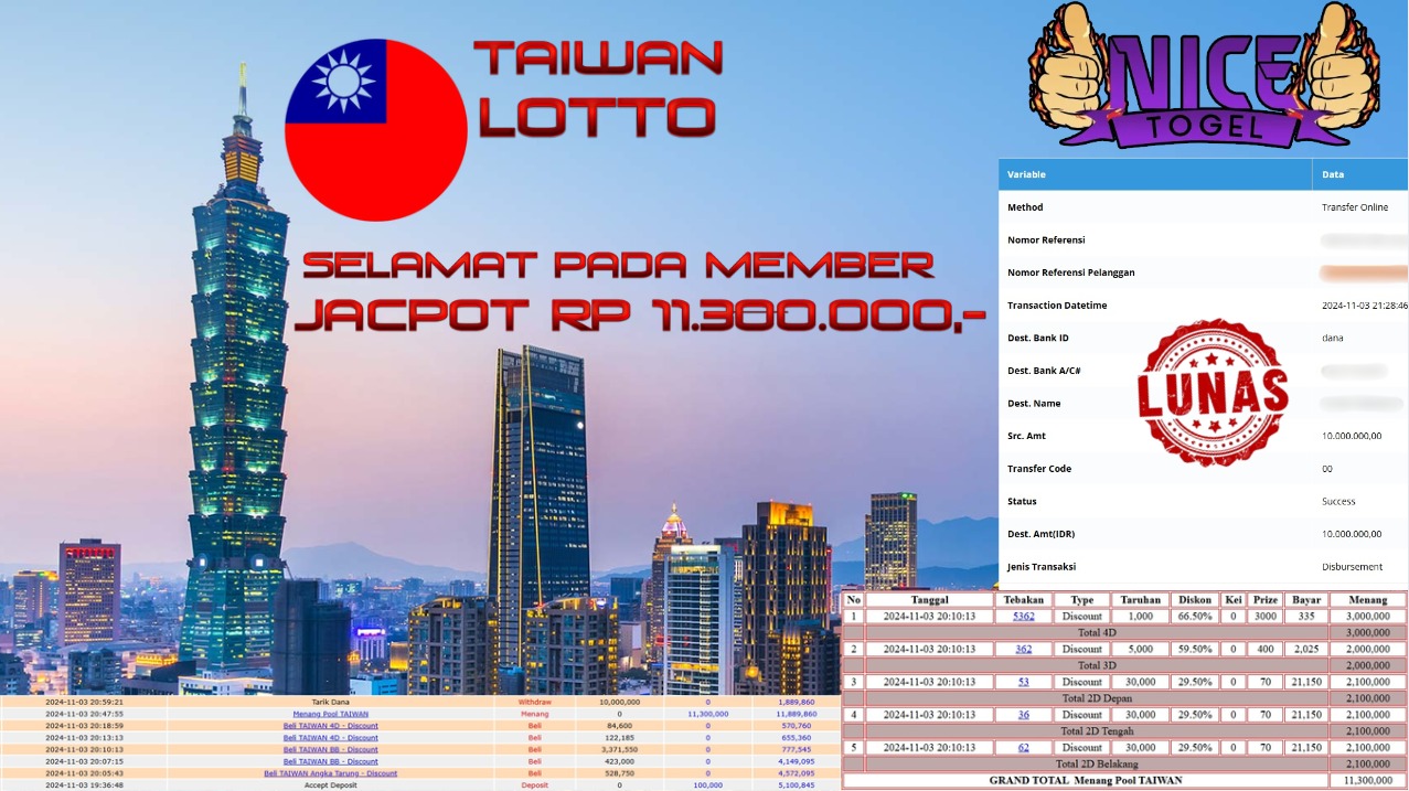 Selamat kepada User id : eng*** Telah berhasil mendapatkan kemenangan besar pada permainan TOGEL TAIWAN LOTTO Dengan kemenangan Sebesar Rp.11.300.000,- Setelah mengisi formulir withdraw dengan kurung waktu hanya 5 – 10 menit pihak NICETOGEL sudah melakukan transfer kepada pemilik Userid dan dana sudah dapat di cairkan oleh pemenang. Bukti pembayaran yang kami berikan merupakan bukti pembayaran yang SAH / VALID yang langung di dapatkan melaui tanda transfer transaksi dari Bank yang di tuju.