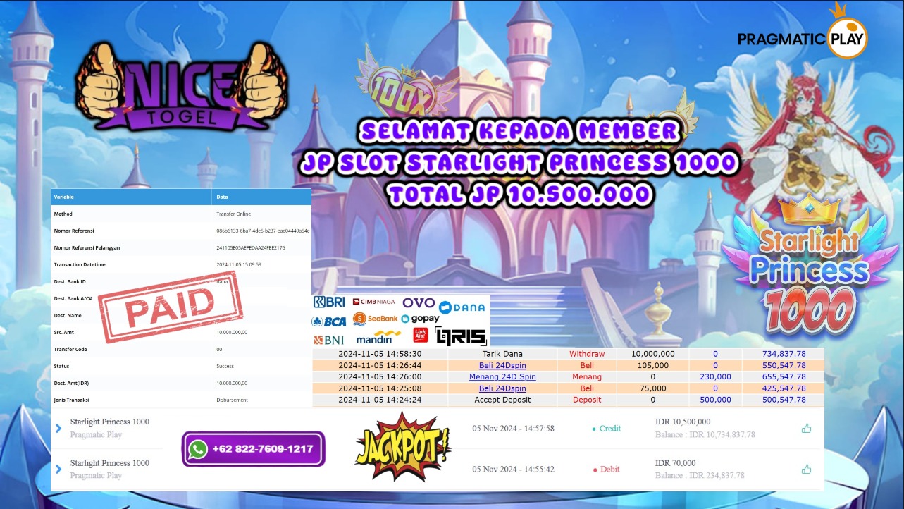 Selamat kepada User id : hor*** Telah berhasil mendapatkan kemenangan besar pada permainan SLOT STARLIGHT PRINCESS 1000 Dengan kemenangan Sebesar Rp.10.500.000,- Setelah mengisi formulir withdraw dengan kurung waktu hanya 5 – 10 menit pihak NICETOGEL sudah melakukan transfer kepada pemilik Userid dan dana sudah dapat di cairkan oleh pemenang. Bukti pembayaran yang kami berikan merupakan bukti pembayaran yang SAH / VALID yang langung di dapatkan melaui tanda transfer transaksi dari Bank yang di tuju.