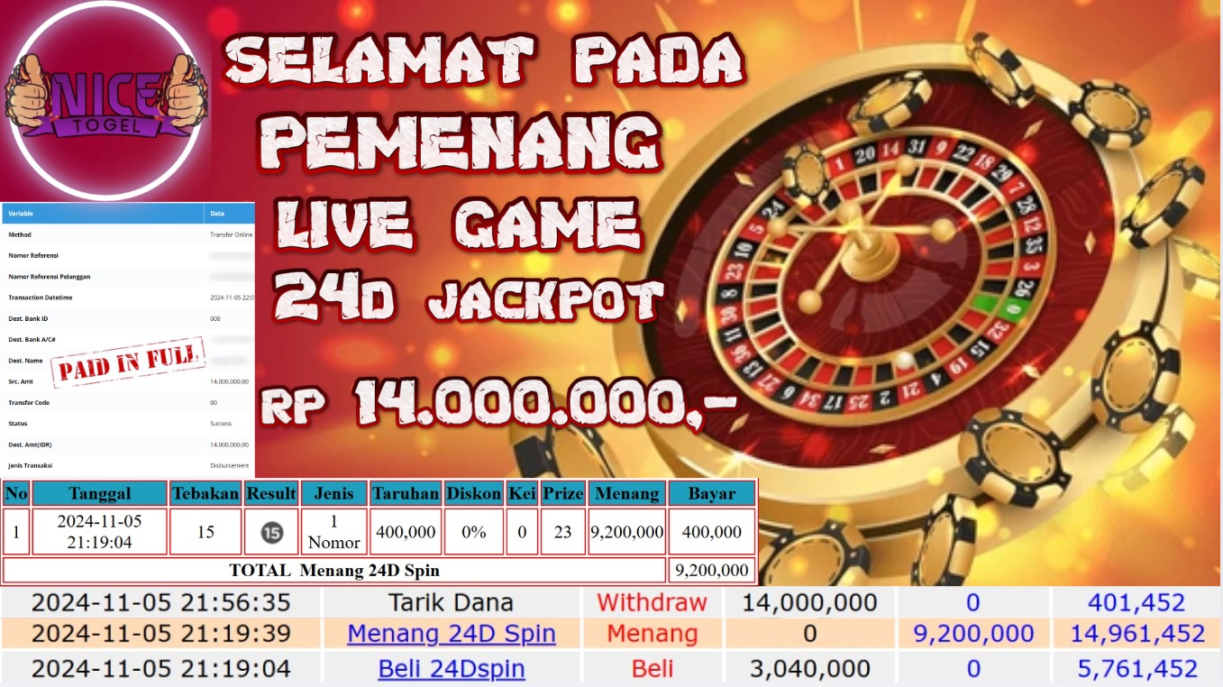 Selamat kepada User id : Cac*** Telah berhasil mendapatkan kemenangan besar pada permainan LIVE GAMES 24D Dengan kemenangan Sebesar Rp.14.000.000,- Setelah mengisi formulir withdraw dengan kurung waktu hanya 5 – 10 menit pihak NICETOGEL sudah melakukan transfer kepada pemilik Userid dan dana sudah dapat di cairkan oleh pemenang. Bukti pembayaran yang kami berikan merupakan bukti pembayaran yang SAH / VALID yang langung di dapatkan melaui tanda transfer transaksi dari Bank yang di tuju.