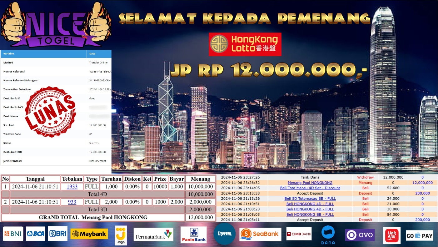 Selamat kepada User id : Osr*** Telah berhasil mendapatkan kemenangan besar pada permainan TOGEL HONGKONG LOTTO Dengan kemenangan Sebesar Rp.12.000.000,- Setelah mengisi formulir withdraw dengan kurung waktu hanya 5 – 10 menit pihak NICETOGEL sudah melakukan transfer kepada pemilik Userid dan dana sudah dapat di cairkan oleh pemenang. Bukti pembayaran yang kami berikan merupakan bukti pembayaran yang SAH / VALID yang langung di dapatkan melaui tanda transfer transaksi dari Bank yang di tuju.