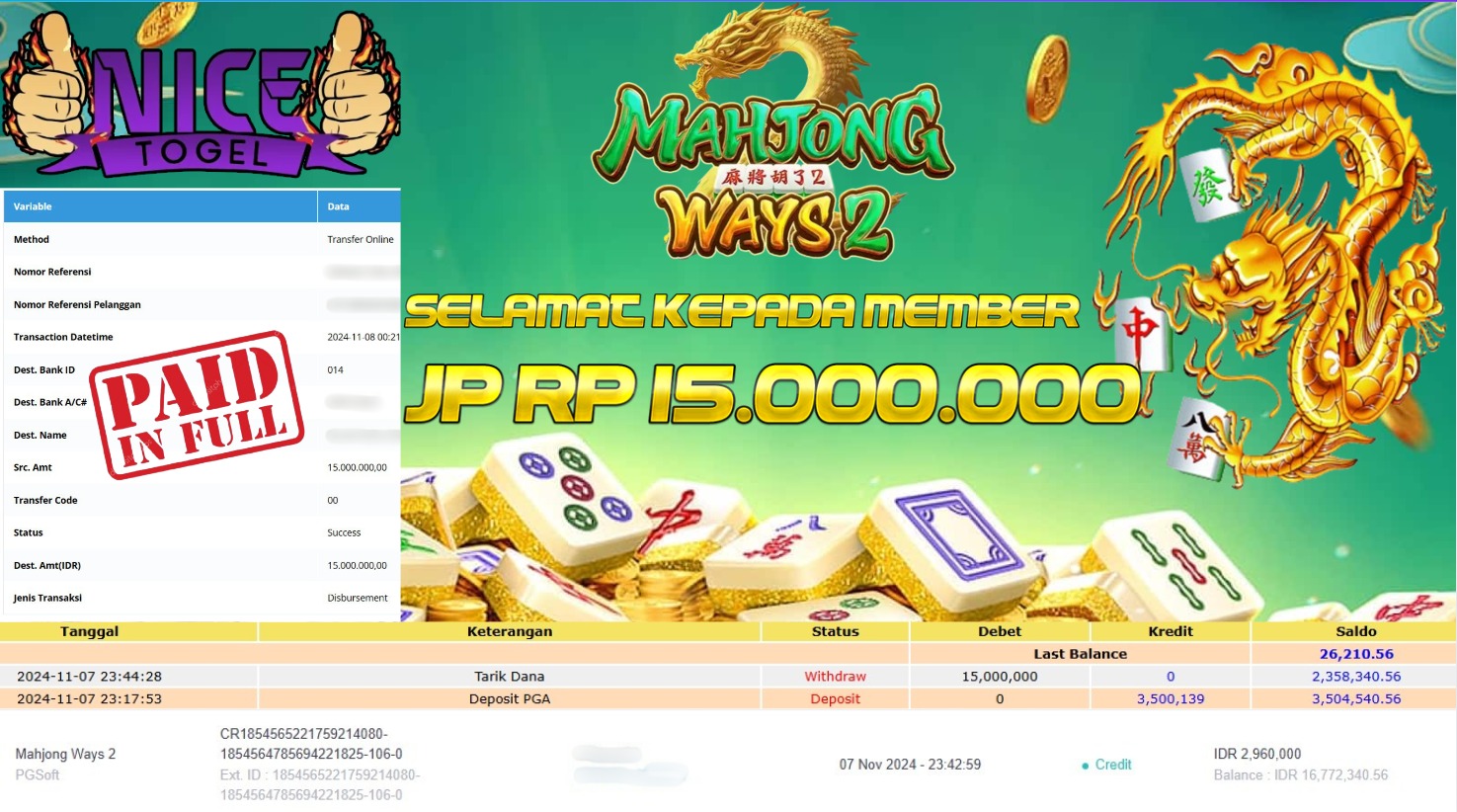 Selamat kepada User id : epr*** Telah berhasil mendapatkan kemenangan besar pada permainan SLOT MAHJONG WAYS2 Dengan kemenangan Sebesar Rp.15.000.000,- Setelah mengisi formulir withdraw dengan kurung waktu hanya 5 – 10 menit pihak NICETOGEL sudah melakukan transfer kepada pemilik Userid dan dana sudah dapat di cairkan oleh pemenang. Bukti pembayaran yang kami berikan merupakan bukti pembayaran yang SAH / VALID yang langung di dapatkan melaui tanda transfer transaksi dari Bank yang di tuju.