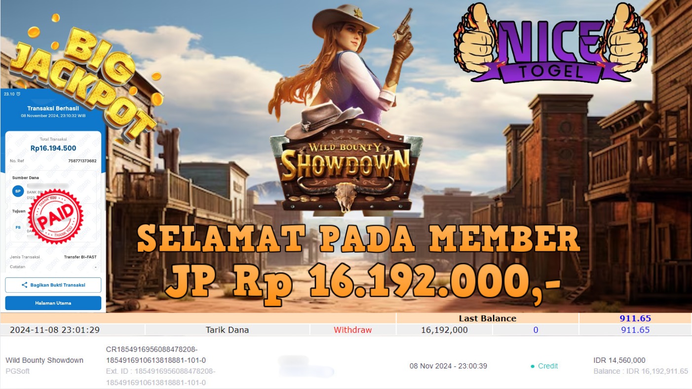 Selamat kepada User id : fur*** Telah berhasil mendapatkan kemenangan besar pada permainan SLOT WILD BOUNTY SHOWDOWN Dengan kemenangan Sebesar Rp.16.192.000,- Setelah mengisi formulir withdraw dengan kurung waktu hanya 5 – 10 menit pihak NICETOGEL sudah melakukan transfer kepada pemilik Userid dan dana sudah dapat di cairkan oleh pemenang. Bukti pembayaran yang kami berikan merupakan bukti pembayaran yang SAH / VALID yang langung di dapatkan melaui tanda transfer transaksi dari Bank yang di tuju.