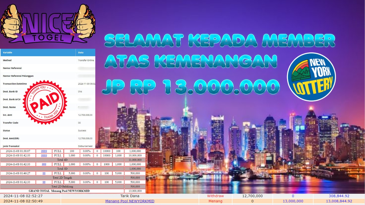 Selamat kepada User id : gon*** Telah berhasil mendapatkan kemenangan besar pada permainan TOGEL NEWYORK.MID Dengan kemenangan Sebesar Rp.13.000.000,- Setelah mengisi formulir withdraw dengan kurung waktu hanya 5 – 10 menit pihak NICETOGEL sudah melakukan transfer kepada pemilik Userid dan dana sudah dapat di cairkan oleh pemenang. Bukti pembayaran yang kami berikan merupakan bukti pembayaran yang SAH / VALID yang langung di dapatkan melaui tanda transfer transaksi dari Bank yang di tuju.