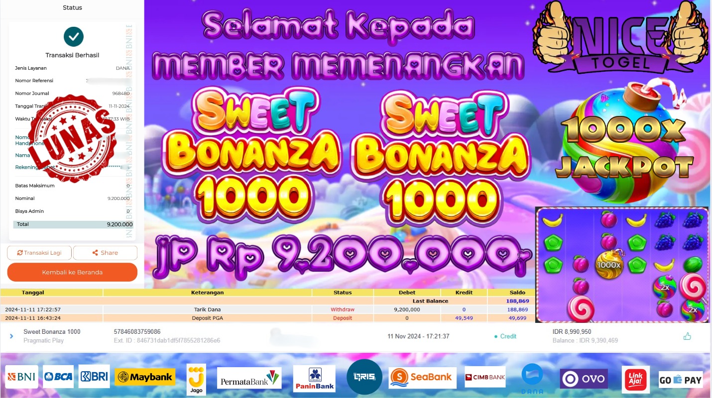 Selamat kepada User id : monc*** Telah berhasil mendapatkan kemenangan besar pada permainan SLOT SWEET BONANZA.1000 Dengan kemenangan Sebesar Rp.9.200.000,- Setelah mengisi formulir withdraw dengan kurung waktu hanya 5 – 10 menit pihak NICETOGEL sudah melakukan transfer kepada pemilik Userid dan dana sudah dapat di cairkan oleh pemenang. Bukti pembayaran yang kami berikan merupakan bukti pembayaran yang SAH / VALID yang langung di dapatkan melaui tanda transfer transaksi dari Bank yang di tuju.