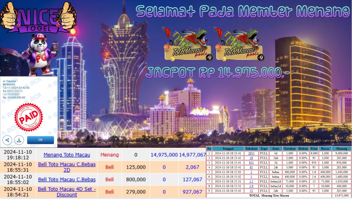 Selamat kepada User id : lanc*** Telah berhasil mendapatkan kemenangan besar pada permainan TOGEL TOTO MACAU Dengan kemenangan Sebesar Rp.14.975.000,- Setelah mengisi formulir withdraw dengan kurung waktu hanya 5 – 10 menit pihak NICETOGEL sudah melakukan transfer kepada pemilik Userid dan dana sudah dapat di cairkan oleh pemenang. Bukti pembayaran yang kami berikan merupakan bukti pembayaran yang SAH / VALID yang langung di dapatkan melaui tanda transfer transaksi dari Bank yang di tuju.