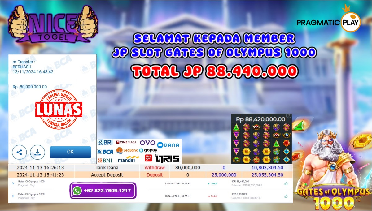 Selamat kepada User id : mans*** Telah berhasil mendapatkan kemenangan besar pada permainan GATES OF OLYMPUS 1000 Dengan kemenangan Sebesar Rp.88.440.000,- Setelah mengisi formulir withdraw dengan kurung waktu hanya 5 – 10 menit pihak NICETOGEL sudah melakukan transfer kepada pemilik Userid dan dana sudah dapat di cairkan oleh pemenang. Bukti pembayaran yang kami berikan merupakan bukti pembayaran yang SAH / VALID yang langung di dapatkan melaui tanda transfer transaksi dari Bank yang di tuju.