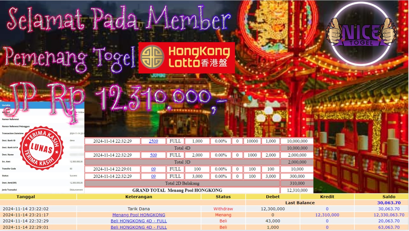Selamat kepada User id : orens*** Telah berhasil mendapatkan kemenangan besar pada permainan TOGEL HONGKONG LOTTO Dengan kemenangan Sebesar Rp.12.310.000,- Setelah mengisi formulir withdraw dengan kurung waktu hanya 5 – 10 menit pihak NICETOGEL sudah melakukan transfer kepada pemilik Userid dan dana sudah dapat di cairkan oleh pemenang. Bukti pembayaran yang kami berikan merupakan bukti pembayaran yang SAH / VALID yang langung di dapatkan melaui tanda transfer transaksi dari Bank yang di tuju.