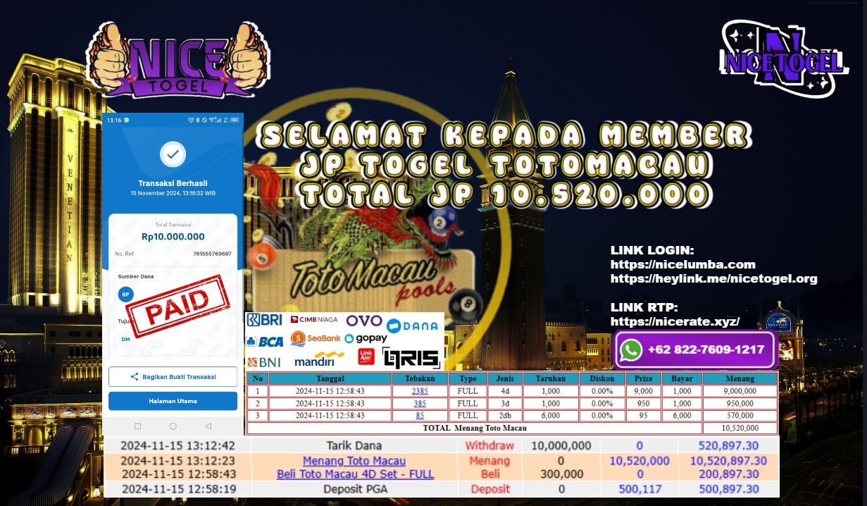 Selamat kepada User id : ma*** Telah berhasil mendapatkan kemenangan besar pada permainan TOGEL TOTO MACAU POOLS Dengan kemenangan Sebesar Rp.10.520.000,- Setelah mengisi formulir withdraw dengan kurung waktu hanya 5 – 10 menit pihak NICETOGEL sudah melakukan transfer kepada pemilik Userid dan dana sudah dapat di cairkan oleh pemenang. Bukti pembayaran yang kami berikan merupakan bukti pembayaran yang SAH / VALID yang langung di dapatkan melaui tanda transfer transaksi dari Bank yang di tuju.