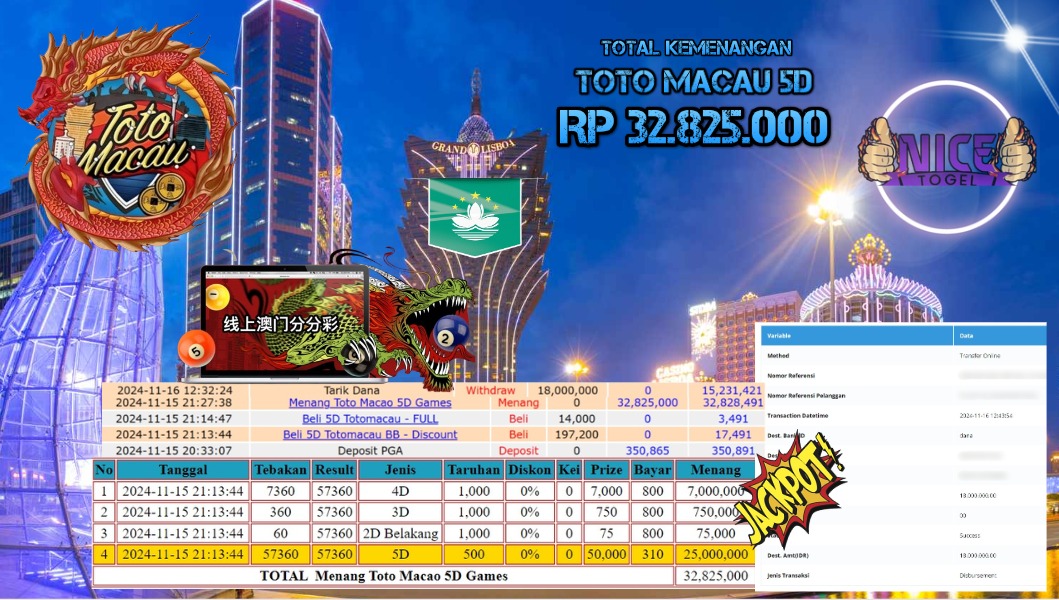 Selamat kepada User id : RDHJ*** Telah berhasil mendapatkan kemenangan besar pada permainan TOGEL TOTO MACAU 5D Dengan kemenangan Sebesar Rp.32.825.000,- Setelah mengisi formulir withdraw dengan kurung waktu hanya 5 – 10 menit pihak NICETOGEL sudah melakukan transfer kepada pemilik Userid dan dana sudah dapat di cairkan oleh pemenang. Bukti pembayaran yang kami berikan merupakan bukti pembayaran yang SAH / VALID yang langung di dapatkan melaui tanda transfer transaksi dari Bank yang di tuju.