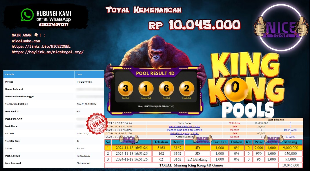Selamat kepada User id : Raet*** Telah berhasil mendapatkan kemenangan besar pada permainan TOGEL KINGKONG POOLS Dengan kemenangan Sebesar Rp.10.045.000,- Setelah mengisi formulir withdraw dengan kurung waktu hanya 5 – 10 menit pihak NICETOGEL sudah melakukan transfer kepada pemilik Userid dan dana sudah dapat di cairkan oleh pemenang. Bukti pembayaran yang kami berikan merupakan bukti pembayaran yang SAH / VALID yang langung di dapatkan melaui tanda transfer transaksi dari Bank yang di tuju.