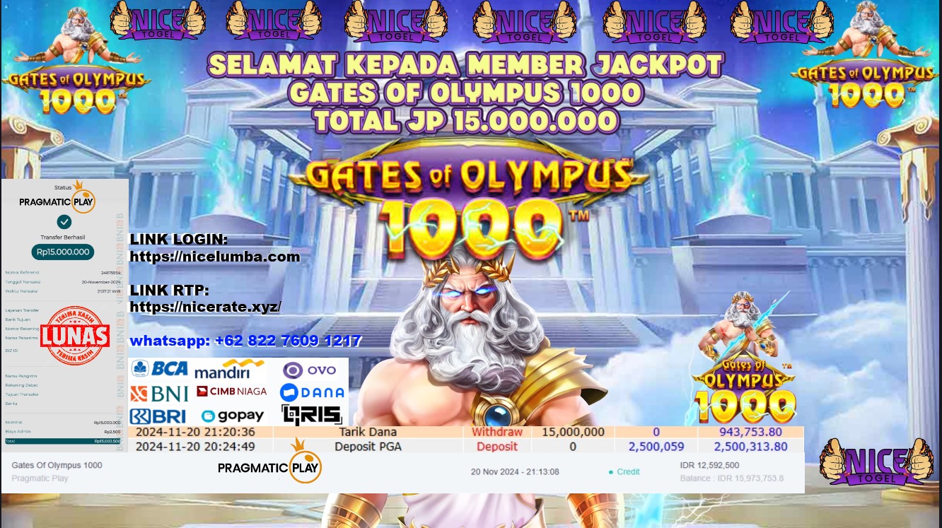 Selamat kepada User id : v1ck*** Telah berhasil mendapatkan kemenangan besar pada permainan GATES OF OLYMPUS 1000 Dengan kemenangan Sebesar Rp.15.000.000,- Setelah mengisi formulir withdraw dengan kurung waktu hanya 5 – 10 menit pihak NICETOGEL sudah melakukan transfer kepada pemilik Userid dan dana sudah dapat di cairkan oleh pemenang. Bukti pembayaran yang kami berikan merupakan bukti pembayaran yang SAH / VALID yang langung di dapatkan melaui tanda transfer transaksi dari Bank yang di tuju.