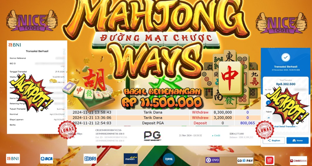 Selamat kepada User id : joha*** Telah berhasil mendapatkan kemenangan besar pada permainan SLOT MAHJONG WAYS Dengan kemenangan Sebesar Rp.11.500.000,- Setelah mengisi formulir withdraw dengan kurung waktu hanya 5 – 10 menit pihak NICETOGEL sudah melakukan transfer kepada pemilik Userid dan dana sudah dapat di cairkan oleh pemenang. Bukti pembayaran yang kami berikan merupakan bukti pembayaran yang SAH / VALID yang langung di dapatkan melaui tanda transfer transaksi dari Bank yang di tuju.