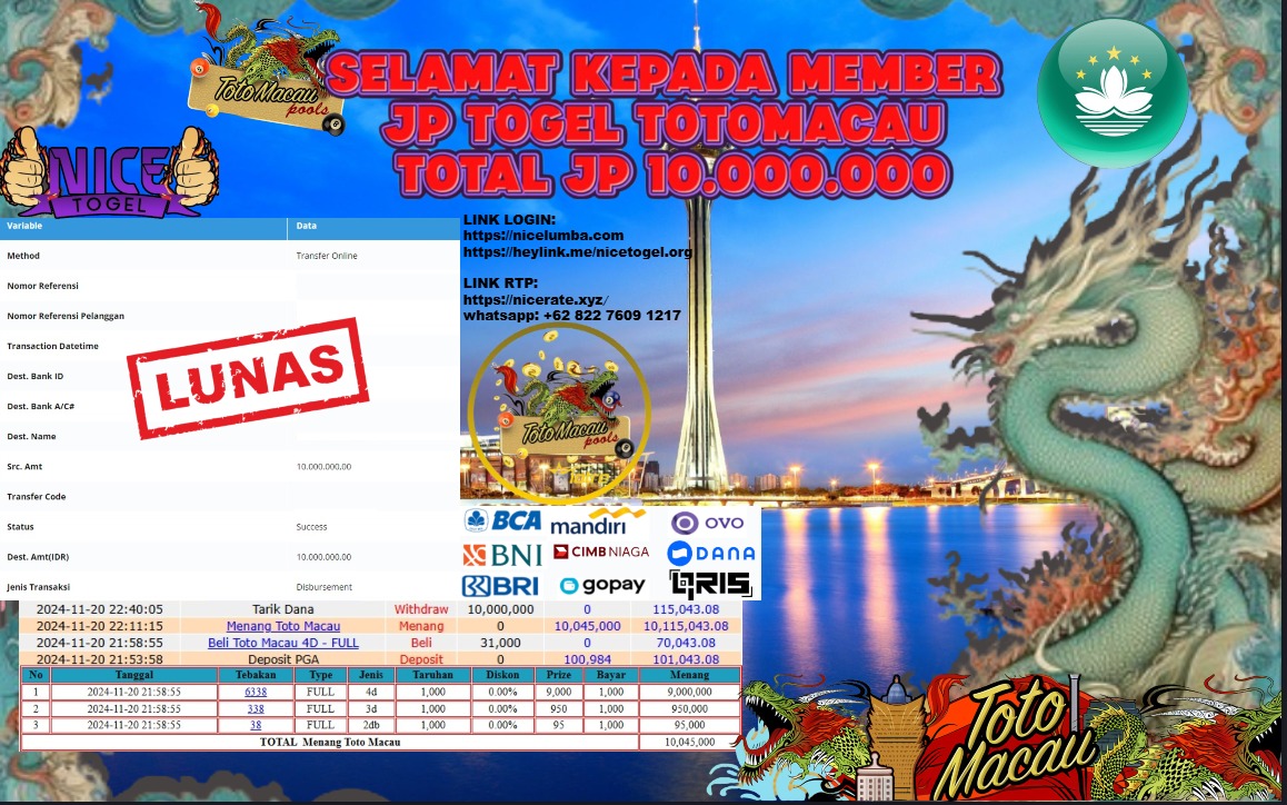 Selamat kepada User id : mem*** Telah berhasil mendapatkan kemenangan besar pada permainan TOGEL TOTO MACAU Dengan kemenangan Sebesar Rp.10.000.000,- Setelah mengisi formulir withdraw dengan kurung waktu hanya 5 – 10 menit pihak NICETOGEL sudah melakukan transfer kepada pemilik Userid dan dana sudah dapat di cairkan oleh pemenang. Bukti pembayaran yang kami berikan merupakan bukti pembayaran yang SAH / VALID yang langung di dapatkan melaui tanda transfer transaksi dari Bank yang di tuju.