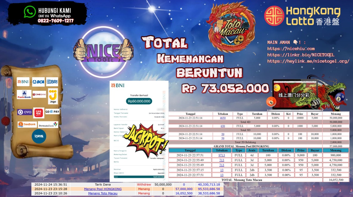 Selamat kepada User id : Eerw** Telah berhasil mendapatkan kemenangan besar pada permainan BERUNTUN TOGEL HONGKONG & TOTO MACAU Dengan kemenangan Sebesar Rp.73.052.000,- Setelah mengisi formulir withdraw dengan kurung waktu hanya 5 – 10 menit pihak NICETOGEL sudah melakukan transfer kepada pemilik Userid dan dana sudah dapat di cairkan oleh pemenang. Bukti pembayaran yang kami berikan merupakan bukti pembayaran yang SAH / VALID yang langung di dapatkan melaui tanda transfer transaksi dari Bank yang di tuju.