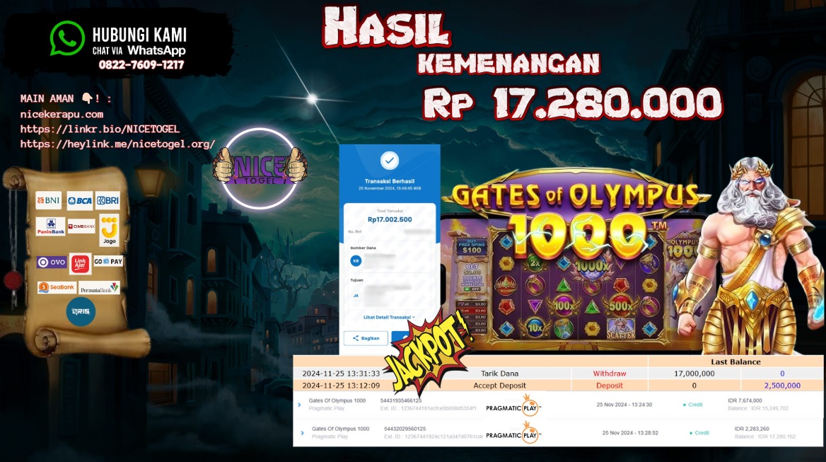 Selamat kepada User id : WEA25*** Telah berhasil mendapatkan kemenangan besar pada permainan SLOT GATES OF OLYMPUS 1000 Dengan kemenangan Sebesar Rp.17.280.000,- Setelah mengisi formulir withdraw dengan kurung waktu hanya 5 – 10 menit pihak NICETOGEL sudah melakukan transfer kepada pemilik Userid dan dana sudah dapat di cairkan oleh pemenang. Bukti pembayaran yang kami berikan merupakan bukti pembayaran yang SAH / VALID yang langung di dapatkan melaui tanda transfer transaksi dari Bank yang di tuju.