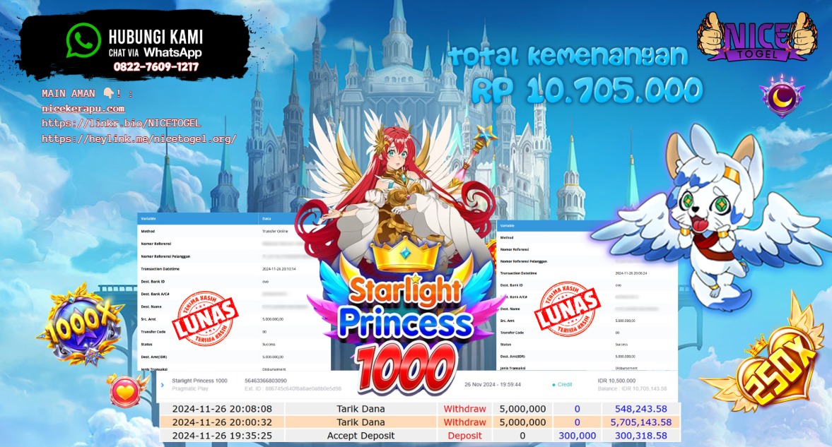 Selamat kepada User id : kon*** Telah berhasil mendapatkan kemenangan besar pada permainan SLOT STARLIGHT PRINCESS 1000 Dengan kemenangan Sebesar Rp.10.705.000,- Setelah mengisi formulir withdraw dengan kurung waktu hanya 5 – 10 menit pihak NICETOGEL sudah melakukan transfer kepada pemilik Userid dan dana sudah dapat di cairkan oleh pemenang. Bukti pembayaran yang kami berikan merupakan bukti pembayaran yang SAH / VALID yang langung di dapatkan melaui tanda transfer transaksi dari Bank yang di tuju.