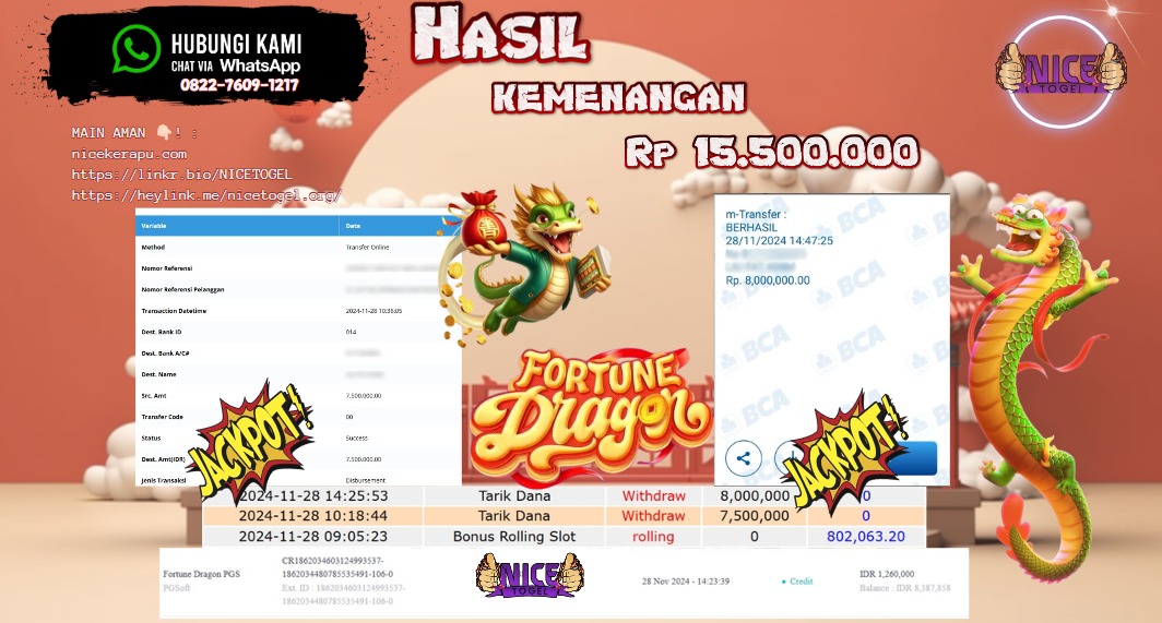 Selamat kepada User id : kimco8*** Telah berhasil mendapatkan kemenangan besar pada permainan SLOT FORTUNE DRAGON Dengan kemenangan Sebesar Rp.15.500.000,- Setelah mengisi formulir withdraw dengan kurung waktu hanya 5 – 10 menit pihak NICETOGEL sudah melakukan transfer kepada pemilik Userid dan dana sudah dapat di cairkan oleh pemenang. Bukti pembayaran yang kami berikan merupakan bukti pembayaran yang SAH / VALID yang langung di dapatkan melaui tanda transfer transaksi dari Bank yang di tuju.