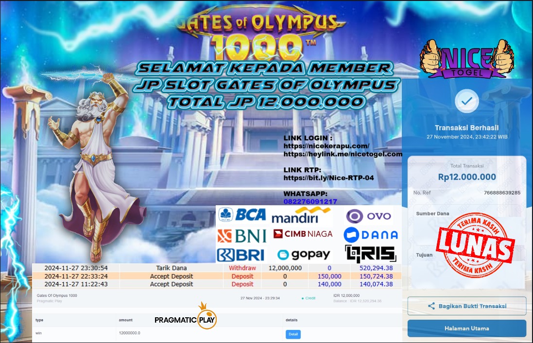 Selamat kepada User id : IREN*** Telah berhasil mendapatkan kemenangan besar pada permainan SLOT GATES OF OLYMPUS 1000 Dengan kemenangan Sebesar Rp.12.000.000,- Setelah mengisi formulir withdraw dengan kurung waktu hanya 5 – 10 menit pihak NICETOGEL sudah melakukan transfer kepada pemilik Userid dan dana sudah dapat di cairkan oleh pemenang. Bukti pembayaran yang kami berikan merupakan bukti pembayaran yang SAH / VALID yang langung di dapatkan melaui tanda transfer transaksi dari Bank yang di tuju.