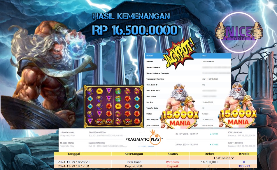 Selamat kepada User id : LOSI78*** Telah berhasil mendapatkan kemenangan besar pada permainan SLOT SLOT 15.000X MANIA Dengan kemenangan Sebesar Rp.16.500.000,- Setelah mengisi formulir withdraw dengan kurung waktu hanya 5 – 10 menit pihak NICETOGEL sudah melakukan transfer kepada pemilik Userid dan dana sudah dapat di cairkan oleh pemenang. Bukti pembayaran yang kami berikan merupakan bukti pembayaran yang SAH / VALID yang langung di dapatkan melaui tanda transfer transaksi dari Bank yang di tuju.